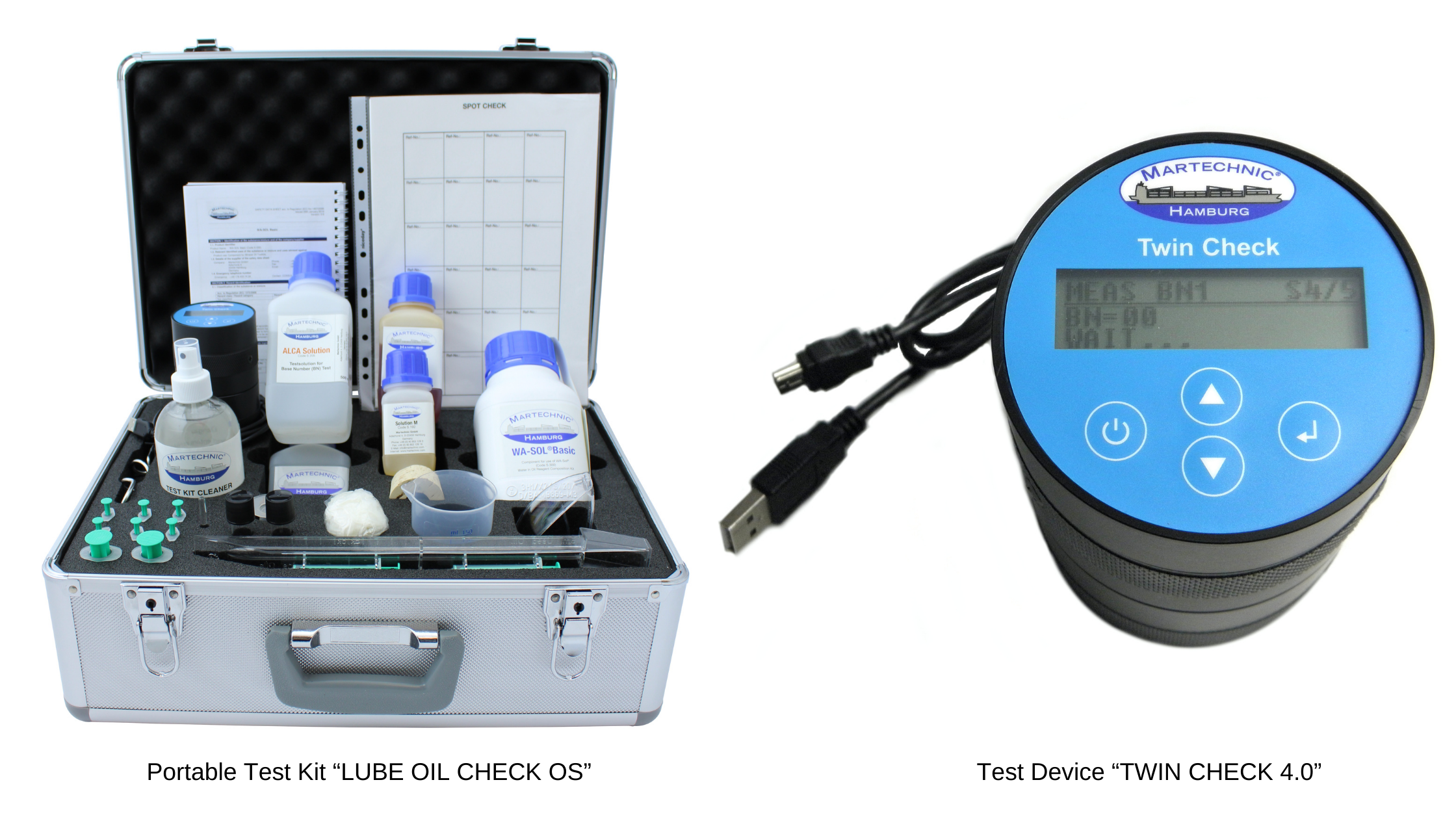 Water-in-oil and alkalinity reserve of lubricants can be measured with the test device “TWIN CHECK 4.0”. The test device measures automatically and precisely both parameters through the built-in pressure sensor which registers pressure build-up in accordance with the degree of water concentration/ BN value in the oil under examination. The “TWIN CHECK 4.0” is offered in modular design with possibility to replace every single constituent part and has a USB to serial cable connection and memory chip for data storage and trend analysis.